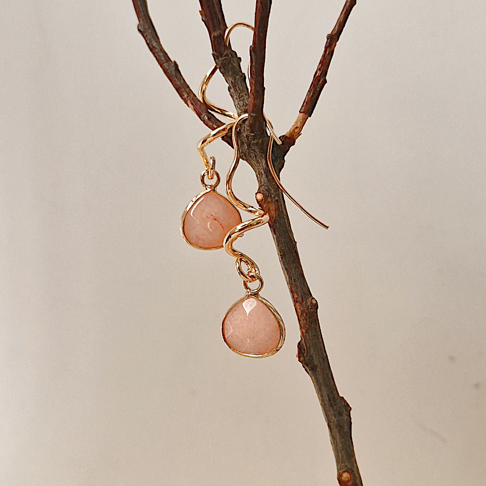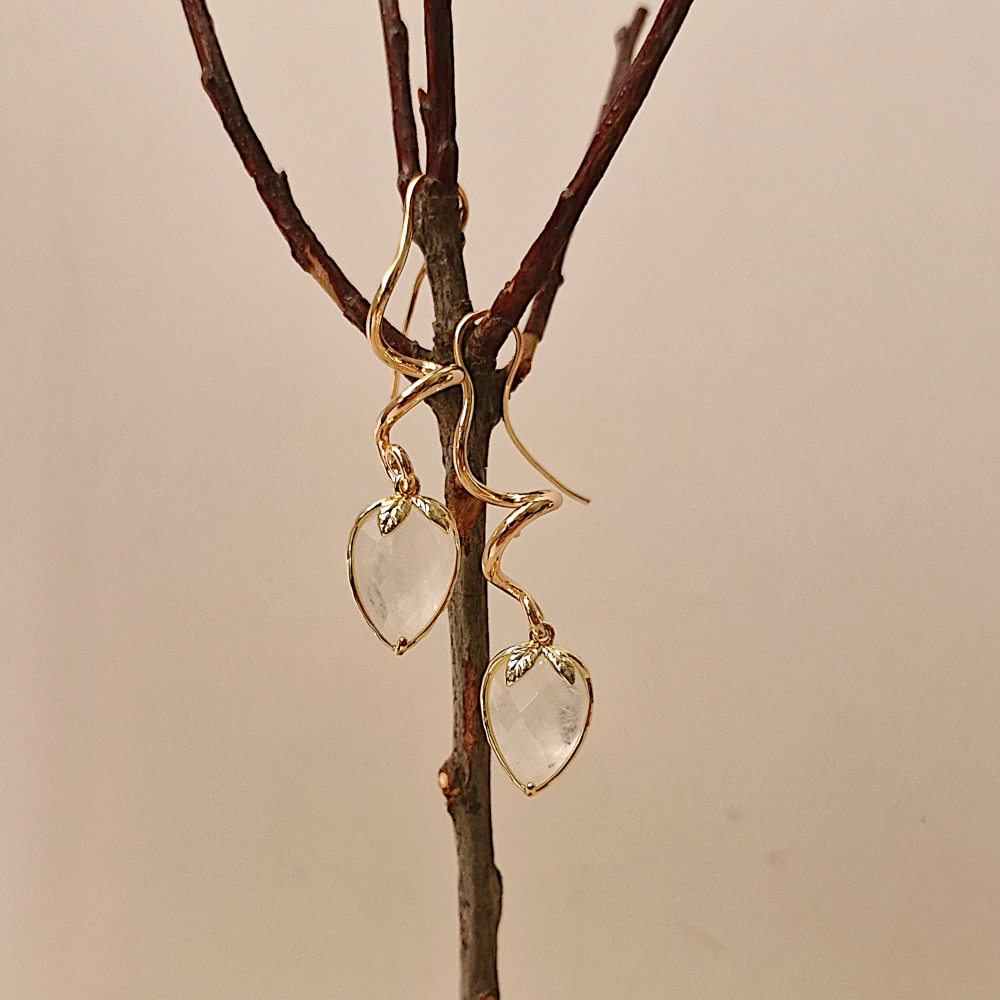 Various gemstones rim set in brass hanging from curled vines design. With fish hook style single drop earrings.