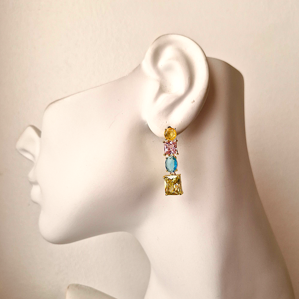 Yellow, pink and blue cubic zirconia stones in a 4 Tier design set in brass and plated in gold.