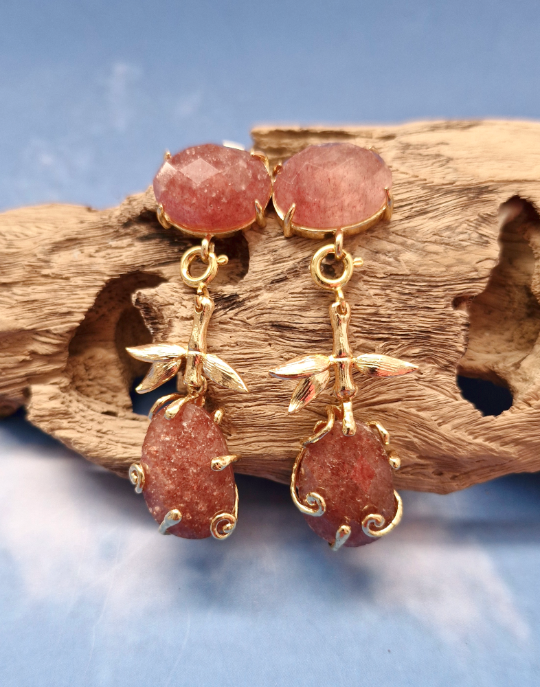 3 layer gemstone stud earrings with detachable bamboo leaf and gemstone dangles.