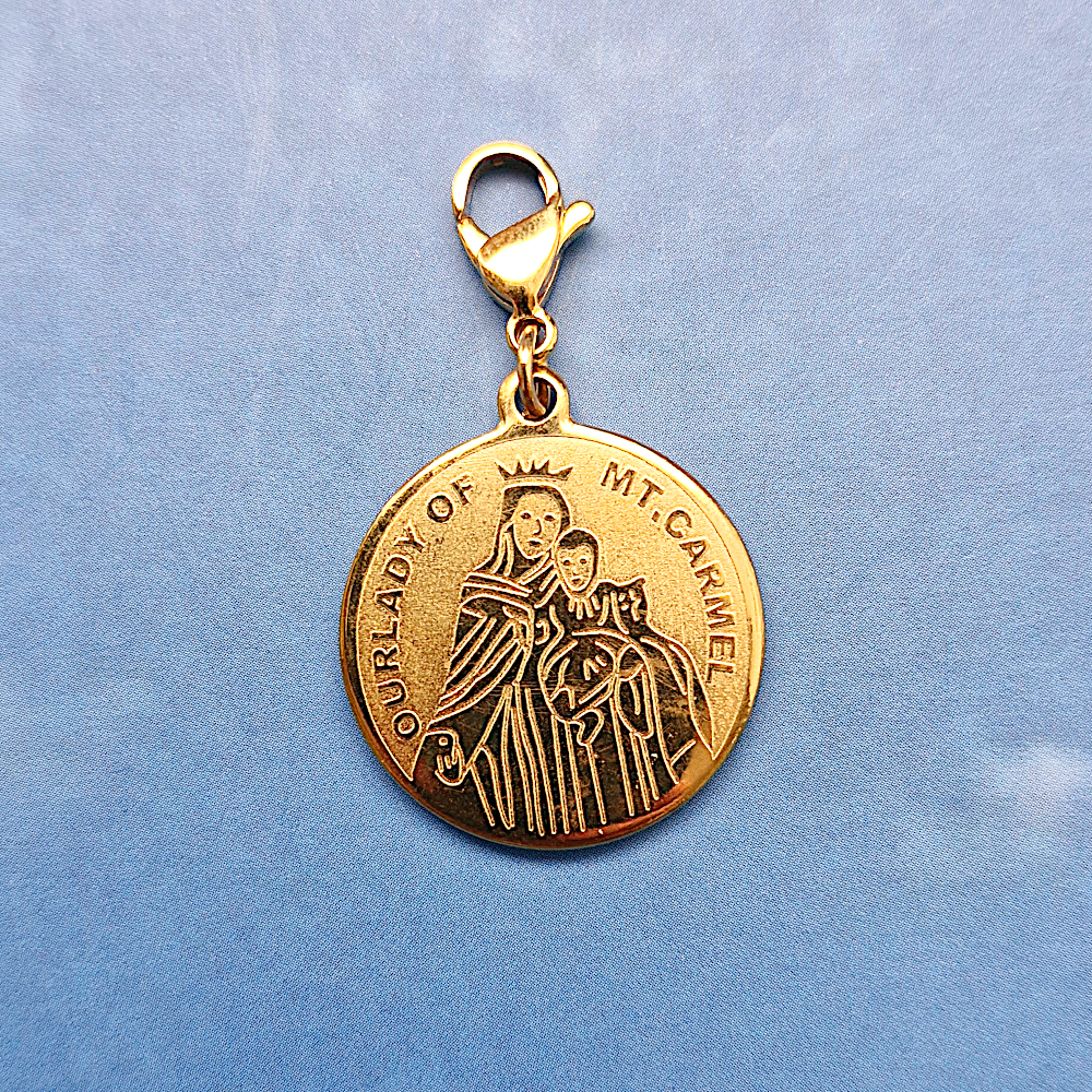 Our lady of Mount Carmel medallion charm in gold plated stainless steel.