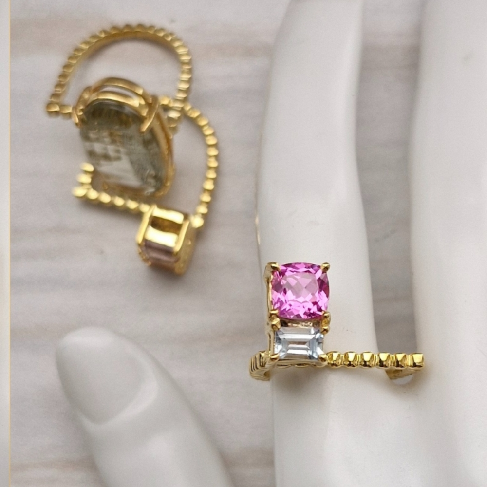 3 separate rings that stack together to form a statement cocktail ring. Individual rings can be worn separately as well. Semi-precious gemstones set in recycled sterling silver and plated in gold.