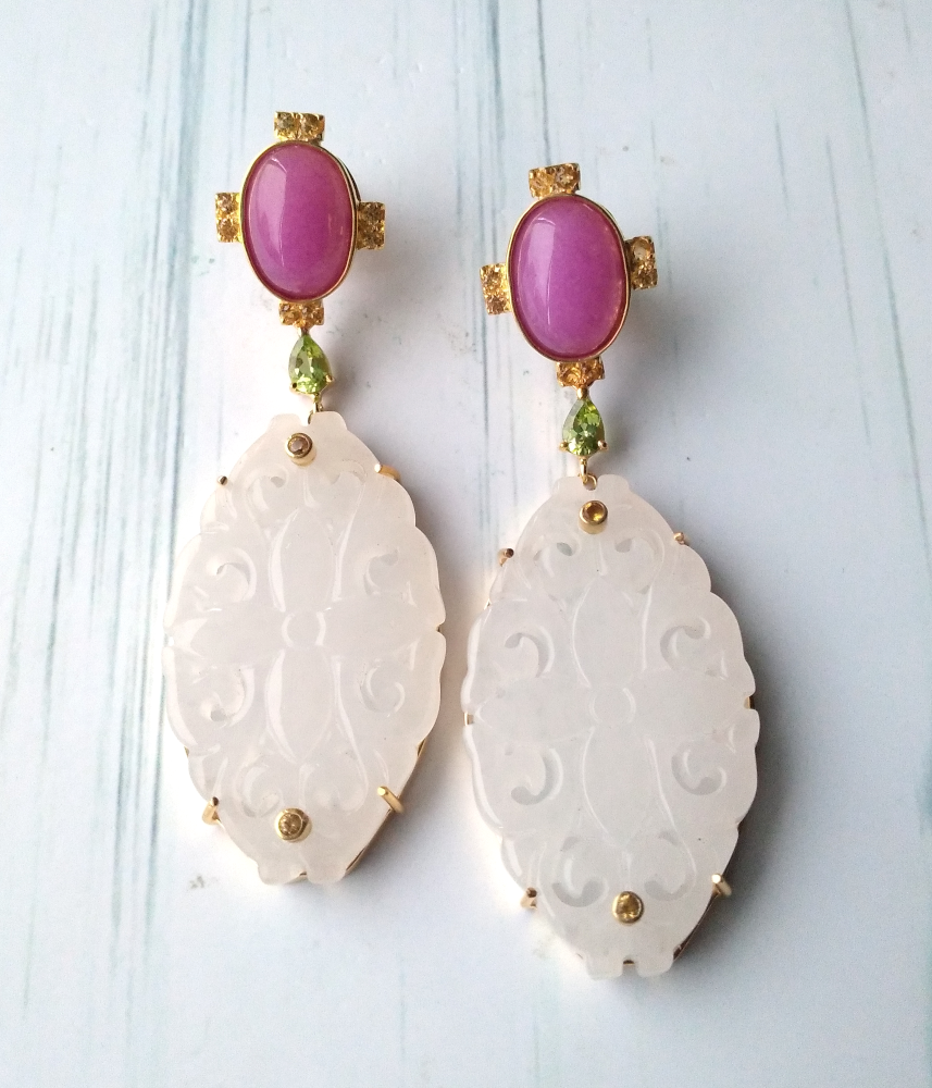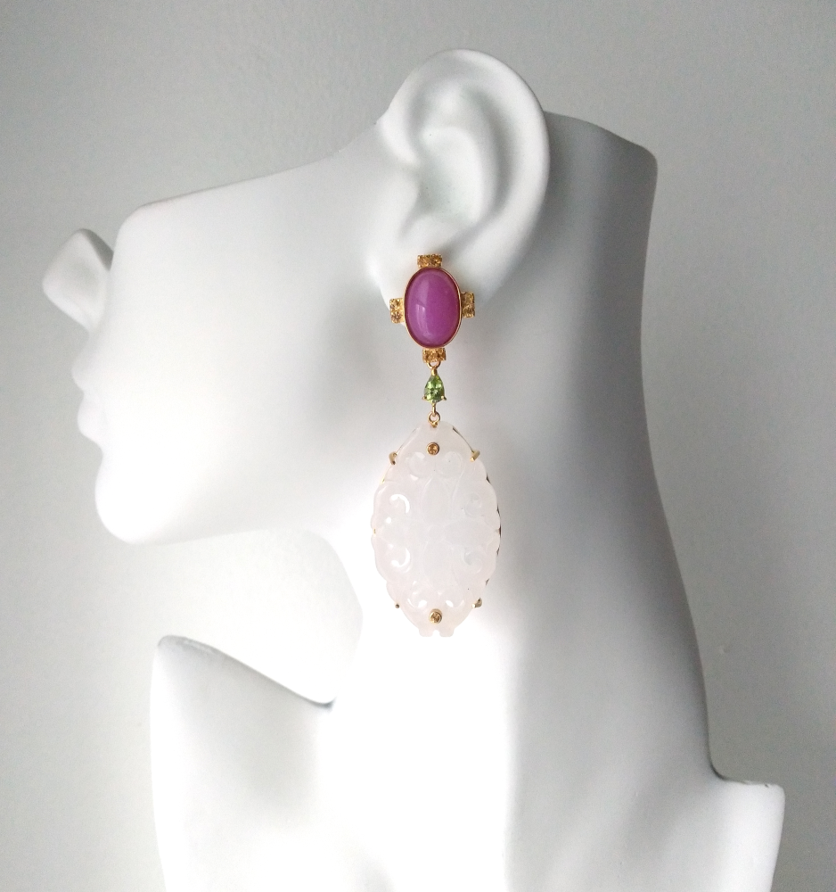 Pink jade studs and citrine accents. Detachable peridot, citrine and carved white jade dangles.